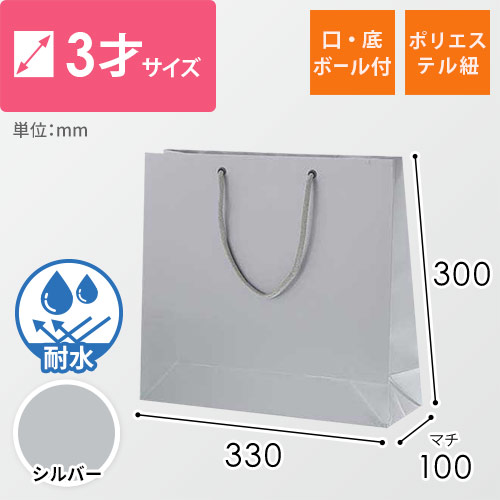 ツヤありPP加工!シルバーで持ち手紐付きの高級ギフトバッグ。光沢があり、上品な仕様です。ギフト包装やお持ち帰りにいかがでしょうか。