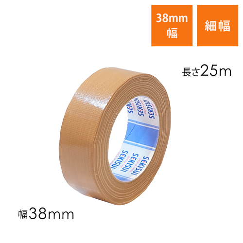 手で切れて丈夫な厚手の布テープ(布製ガムテープ)。通常幅だと太い方におすすめな細幅・38mmです。高さの無い箱の梱包におすすめ。
