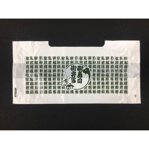 寿司1〜2人前の持ち帰りに最適な角底レジ袋。自立性に優れ、すし柄印刷がテイクアウトを彩ります。
