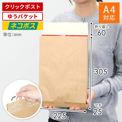 クリックポスト・ゆうパケット対応サイズ。幅225×高さ305×マチ25mmで茶無地・サイドマチ付き・開封テープ付き宅配袋
