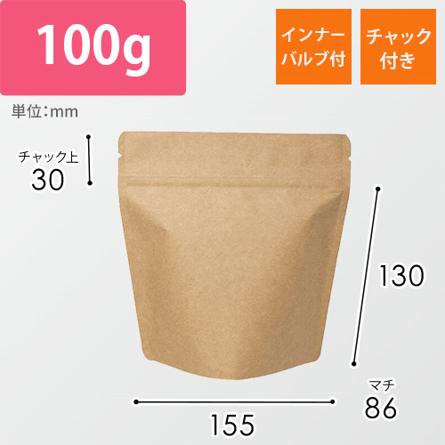 サイズが155×86×160mmで100gのコーヒーが入るクラフト仕様のパッケージ。インナーバルブによりコーヒーから出るガスを放出し、袋の破裂防止に!