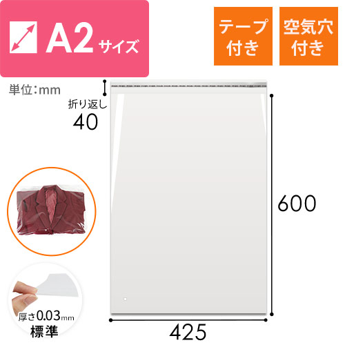 A2が入る大きさで、空気穴とテープ付きの透明OPP袋。標準的な厚さ0.03mmの袋で、パリッとした質感や透明度の高さが特徴です。空気を逃がせるため破裂しにくく、洋服のラッピングや商品梱包におすすめ。