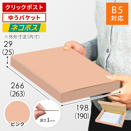 表面にピンク色のカラーライナーを使用したメール便ケース。高級感ある見た目に仕上がるため、通販商品の発送やパッケージなどにおすすめです。