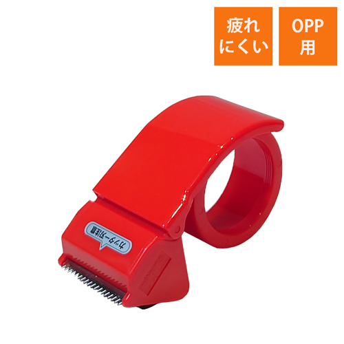 梱包作業をもっと簡単に!女性でも使いやすいOPPテープ用のテープカッター。軽くて疲れにくいプラスチック製で、製造物や通販商品の梱包に便利です。注意書き入りで安全に作業できます。