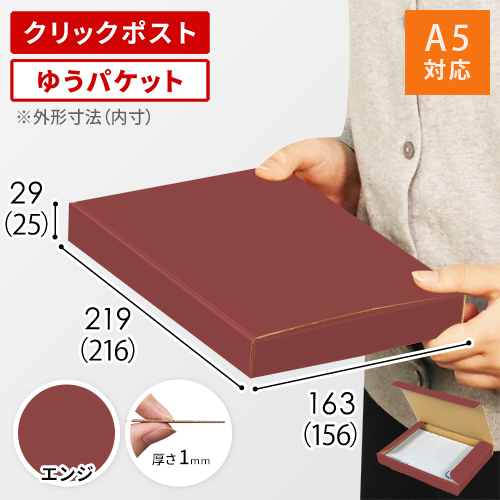 表面にエンジ色のカラーライナーを使用したメール便ケース。高級感ある見た目に仕上がるため、通販商品の発送やパッケージなどにおすすめです。