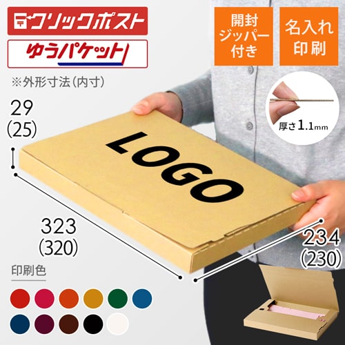 社名やロゴ等のお客様オリジナルデザインを印刷した、クリックポスト対応でゆうパケット最大のメール便ケースです。テープレス仕様で梱包・発送の作業も簡単。