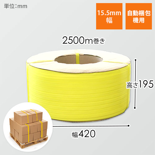 大きな荷物の運搬をサポート!自動梱包機用PPバンド(黄)。一般的な自動梱包機に合わせた15.5mm幅で、家具や家電、部品といった大きな物の梱包に便利です。