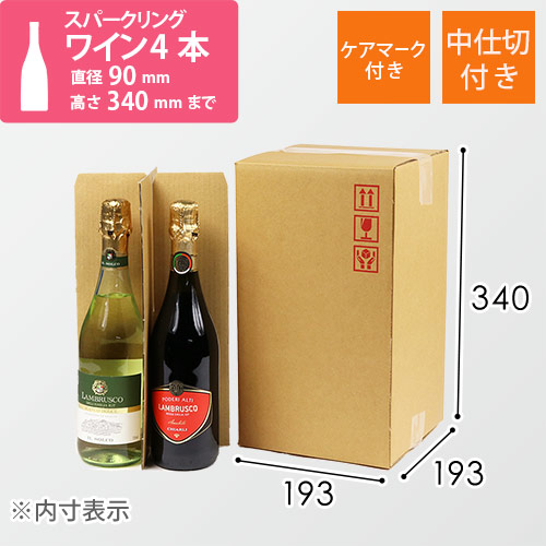 ワインボトルよりも直径サイズが大きいスパークリングワインボトルを4本発送する際に便利な宅配用段ボール箱です。専用仕切りつきで緩衝性が高い商品です。