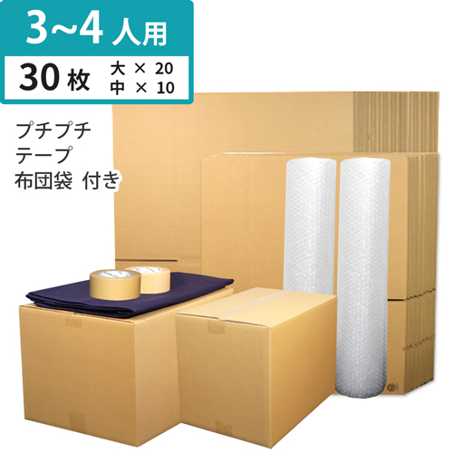 ダンボール箱:中(370×253×270mm)10枚、ダンボール箱:大(445×340×282mm)20枚の合計30枚とプチプチ、クラフトテープ、布団袋のセット。3~4人の引っ越しに最適です。