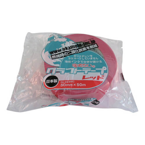 幅50mm×長さ50m×厚さ0.14mmで赤色のクラフトテープ。燃焼時に二酸化炭素発生量を抑える古紙配合のエコロジー紙管を採用しています。カラータイプで梱包物の識別に便利です。油性ペンでの文字記入が可能。