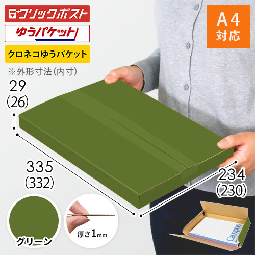 表面に青菜色のカラーライナーを使用したメール便ケース。高級感ある見た目に仕上がるため、通販商品の発送やパッケージなどにおすすめです。