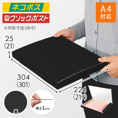 表面に黒色のカラーライナーを使用したメール便ケース。高級感ある見た目に仕上がるため、通販商品の発送やパッケージなどにおすすめです。