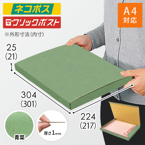 表面に青菜色のカラーライナーを使用したメール便ケース。高級感ある見た目に仕上がるため、通販商品の発送やパッケージなどにおすすめです。