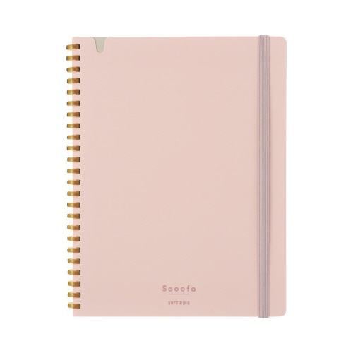A5変形、方眼罫、80枚。切り取りミシン目入りで、ゴムバンド付きのピンクの表紙。