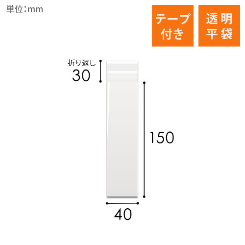 40mm×150mmのテープ付きOPP袋です。0.03mm厚の透明でパリッとした質感が特徴。パーツやアクセサリーなどの梱包に最適です。