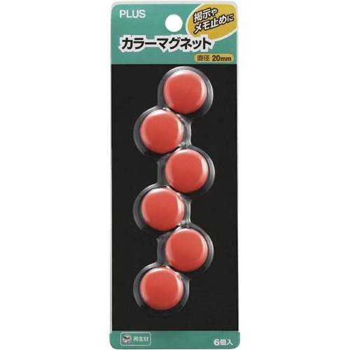 直径20mmのレッドカラーマグネット。80%再生樹脂を使用。6個×10セット入り。