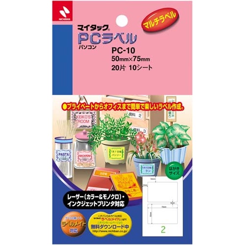 マイタックPCラベルは、はがきサイズで2片のラベルが10枚入っています。樹脂ラミネート加工なしのはく離紙を使用。