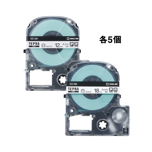 PROテープ10個パック。黒文字印刷、白ラベル、テープ長8m。12mm幅と18mm幅各5個入りで計10個の混在パックです。