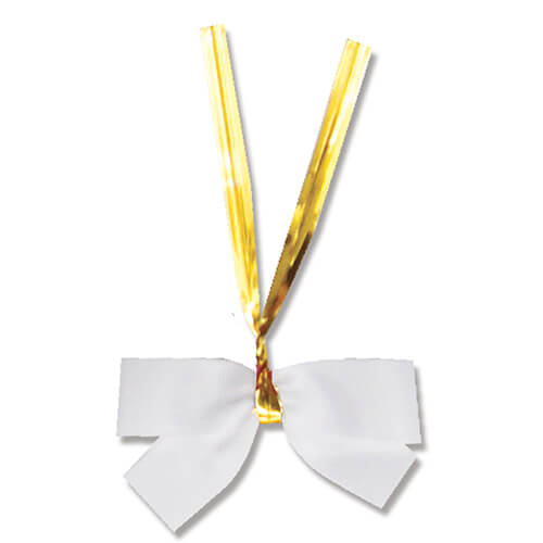 袋の口に結ぶだけで簡単に飾れるリボン付きタイ。リボンは汎用性の高い白色です。お菓子や小物などを入れた袋の口留めやラッピングアクセントに。