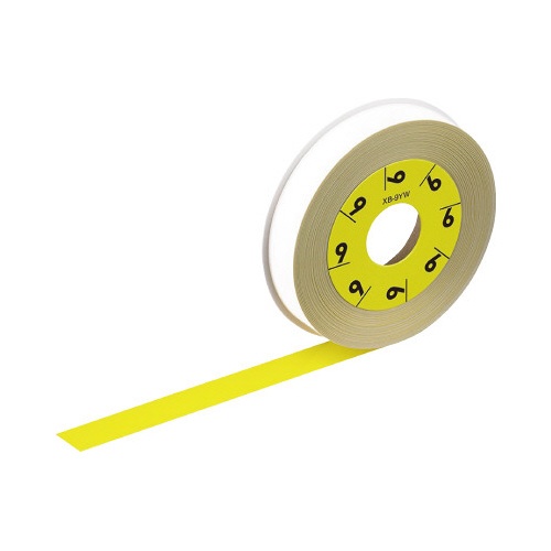 カシオ計算機製LATEKOラベルライター用、黄色テープ(黒文字、9mm幅)。カートリッジは繰り返し使えて経済的!