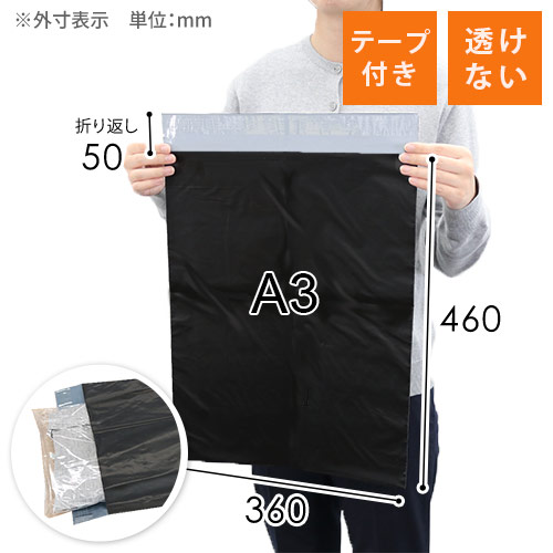 水に強いポリエチレンを使用したA3サイズの宅配ビニール袋。直輸入のため安価でお買い求めいただけます。中身が透けない仕様です。