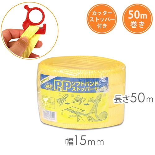【手締め用】結束用品の定番、PPバンド(黄)。使い勝手が抜群の、柔らかく手に優しい材質です。ストッパー・カッター付き。