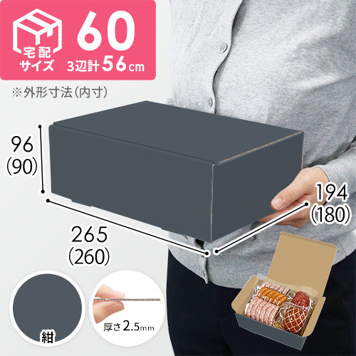 表面に紺色のカラーライナーを使用した宅配60サイズ対応ダンボール箱。高級感ある見た目に仕上がるため、通販商品の発送やパッケージなどにおすすめです。