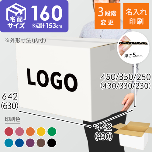 宅配160サイズの高さ変更可能白色ダンボールに、お客様のロゴや社名などを名入れ印刷します。(M-160Kと同サイズ)