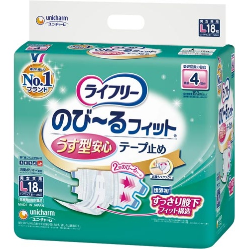 のび〜るテープでどんな姿勢・体型にもフィット。全面通気シートでムレを防ぎ、お肌サラサラ!Lサイズ、ヒップ81〜128cm。