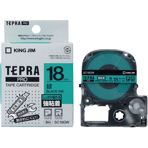 テプラPROテープ、強粘着の緑ラベル。18mm幅、黒文字。8m巻。PP素材や曲面にもしっかり貼れます!