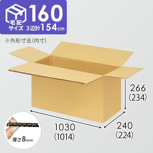 1100×800mmのカゴ台車に3面×8段積める、納品向けダンボール箱。内寸は1020×230×210mmで、宅配160サイズに対応しています。