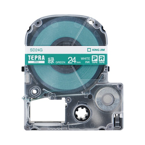 ビビッドな緑ラベルに白文字が映える、PROテープカートリッジ 24mm幅。すっきりした印象を与え、8m巻き。