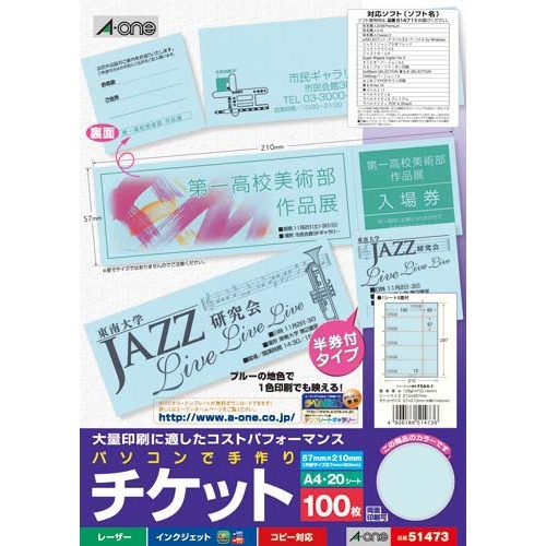 各種プリンタに対応した、半券付きチケット用紙(ブルー、20枚入)。A4サイズ、5面カット。