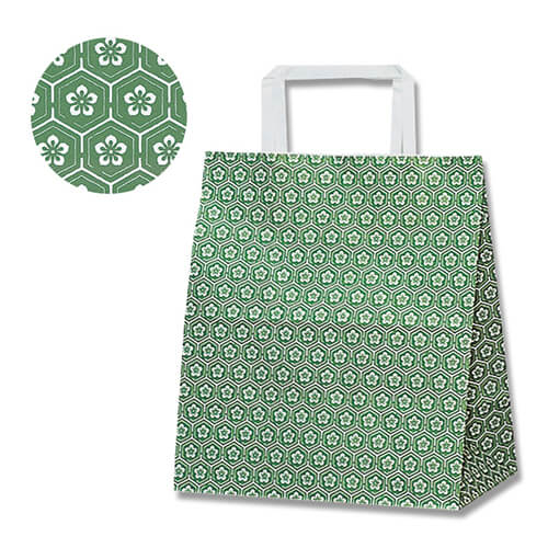爽やかな緑の梅小紋柄の手提げ紙袋。小型でマチ幅が広めの人気サイズです。手に優しい平紐タイプで和菓子や和雑貨の持ち帰りやギフト用に最適。