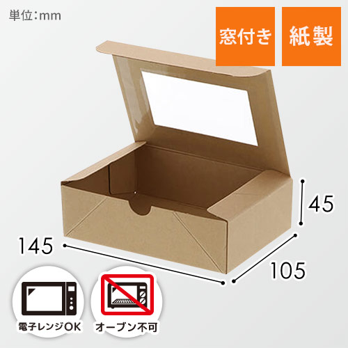 クラフト製の窓付き箱。サイズは縦105×横145×高45mmで、テイクアウトやパッケージに適しています。
