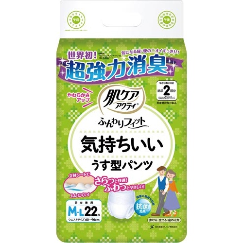 尿・汗・便臭をやわらげる抗菌消臭シート採用。歩ける方、立てる方、座れる方におすすめのうす型タイプ。M-Lサイズ、22枚×4パック。