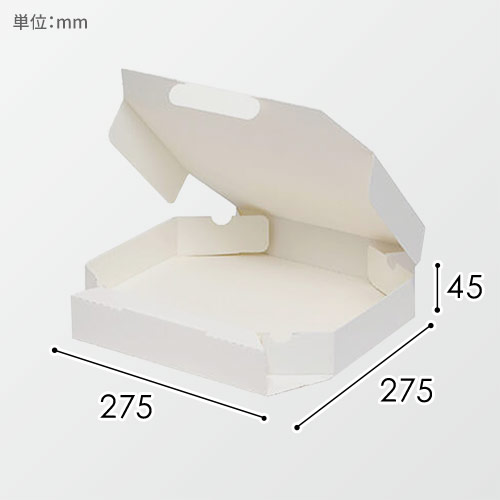 10インチ(約25cm)のピザが入る八角形のピザ用ボックス。サイズは275×275×45mmで、使いやすいシンプルな白無地タイプです。リーズナブルな価格も魅力。