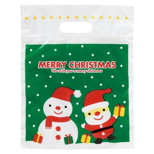 にぎやかで可愛らしいミニサンタデザインのポリエチレン製持ち帰りバッグ。楽しいクリスマスのギフトや商品に最適です。