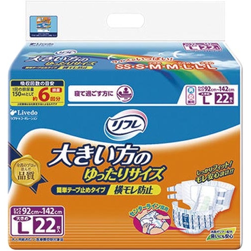大きめLサイズ、ヒップ92〜135cm。850ml吸収。消臭ポリマー採用で快適!22枚×3パック入り。