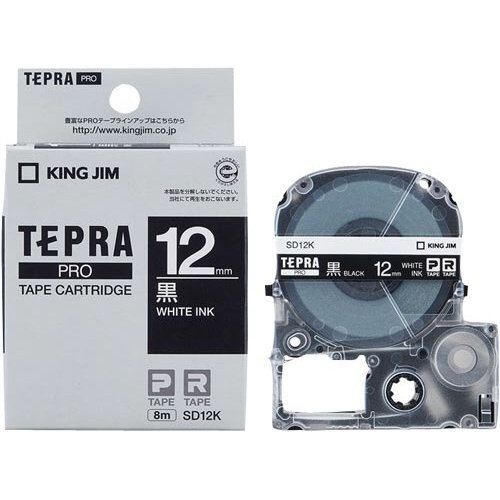 黒地に白文字が鮮やかなテプラPROテープ。整理整頓やラベリングに最適な12mm幅、8m巻。