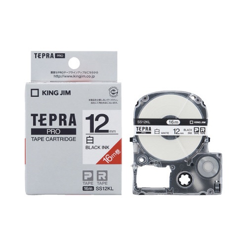 テプラPROテープ ロングタイプ 白ラベル/黒文字 12mm幅 16m巻。使用済みカートリッジを回収・再資源化。