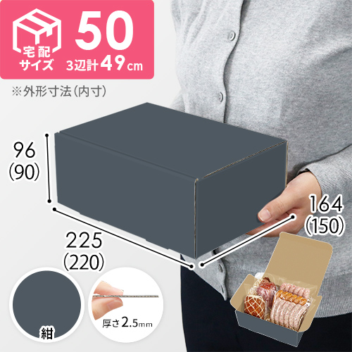 表面に紺色のカラーライナーを使用した宅配60サイズ対応ダンボール箱。高級感ある見た目に仕上がるため、通販商品の発送やパッケージなどにおすすめです。
