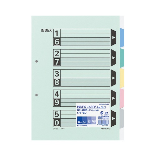 A4サイズ、2穴、5山のカラー仕切カード。10組入りでたっぷり使えます。コクヨ製。