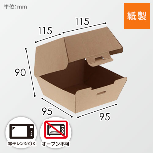 クラフト製のバーガーボックス。サイズは天面115×115・底面95×95・高90mmで、テイクアウトやパッケージに適しています。