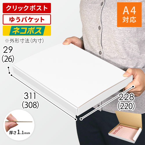 ネコポス・クリックポストに対応!A4サイズ・厚さ3cmの白色メール便ケース。テープレス仕様で梱包・発送の作業も簡単。