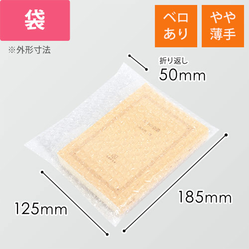 外側に粒がついておりスムーズに出し入れ可能なプチプチ袋。サイズは口幅120×深さ130+折り返し35mm(外寸)です。小粒タイプのため厚みを抑えたいときに最適。