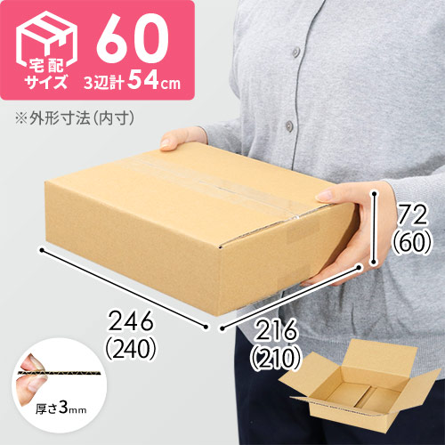 宅配60サイズで発送できる薄型のダンボール箱。サイズは長さ240×幅210×深さ60mmです。アパレル商品や雑貨などの発送・収納用に。
