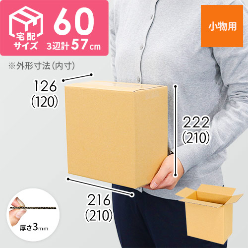 小物や雑貨の発送に最適な小型の宅配60サイズ対応ダンボール箱。三辺合計57cmと、60フルサイズ仕様では大きすぎる方におすすめです。やや深型なので高さのある商品にもピッタリ。
