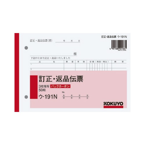 コクヨの3枚訂正返品伝票。B6ヨコサイズ、バックカーボン式で50組入り。赤カーボン使用。