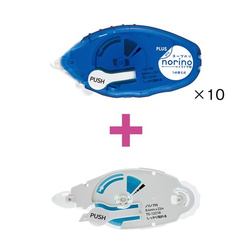ノリノプロしっかり貼れる本体10個+詰め替え1個のお得なセット。テープ幅8.4mm×長さ22m。